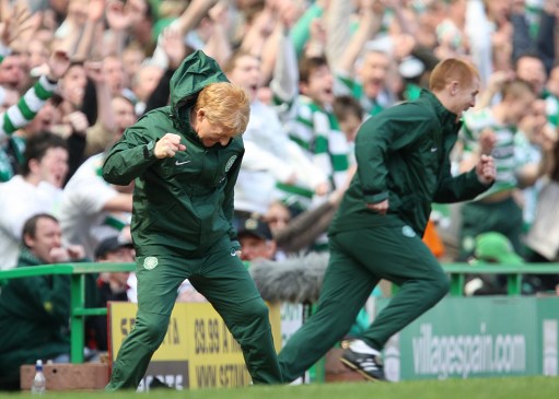 Gordon Strachan and coach Neil Lennon celebrate a Celtic goal against Rangers