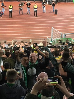 Time for some food and a drink. Actually, time for a meal and a night out but the fans are arriving early and creating a good atmosphere, even at this stage. I pick up a text from Lubeck Joe advising that he is just a few rows behind me. So the obligatory photos are exchanged with my big German pal, who I first met in St Gallen, for the pre-season friendly. It’s good to see him, as always.