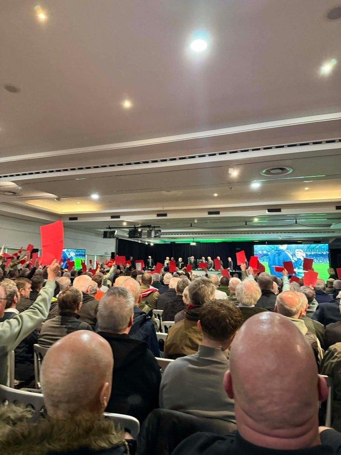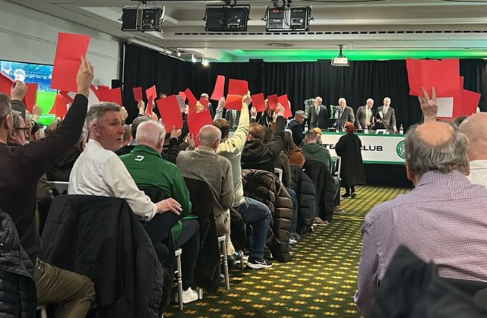The Celtic Board has now reappeared with Peter Lawwell issuing a yellow card of his own with a warning that further ‘bad behaviour will see the meeting cancelled. Around a hundred shareholders stage a walk-out in protest against the Celtic Board while the Celtic Chairman gets to play his ‘everything in the garden is rosy’ video.