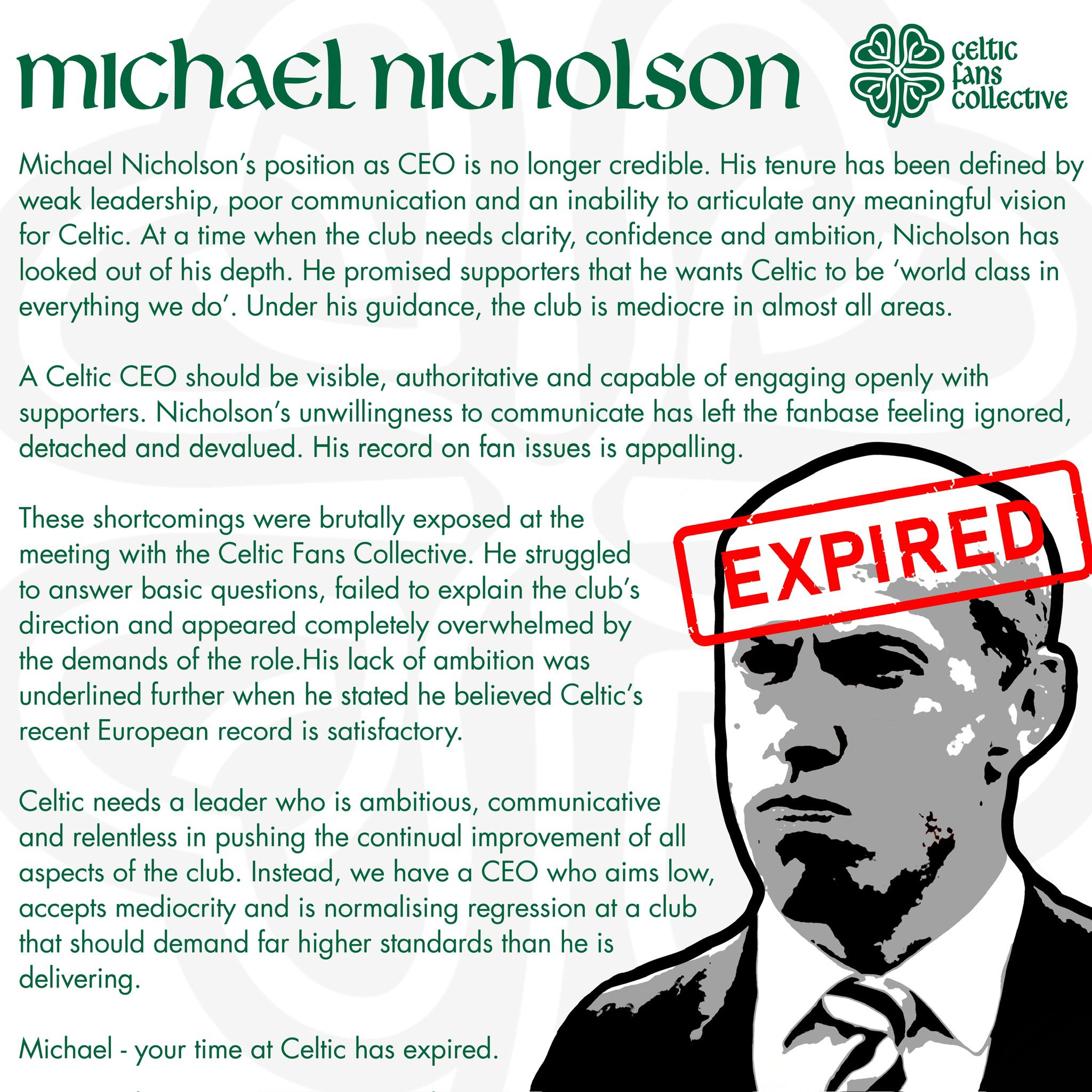 “Michael Nicholson’s position as CEO is no longer credible. His tenure has been defined by weak leadership, poor communication and an inability to articulate any meaningful vision for Celtic. At a time when the club needs clarity, confidence and ambition, Nicholson has looked out of his depth. He promised supporters that he wants Celtic to be ‘world class in everything we do’. Under his guidance, the club is mediocre in almost all areas.