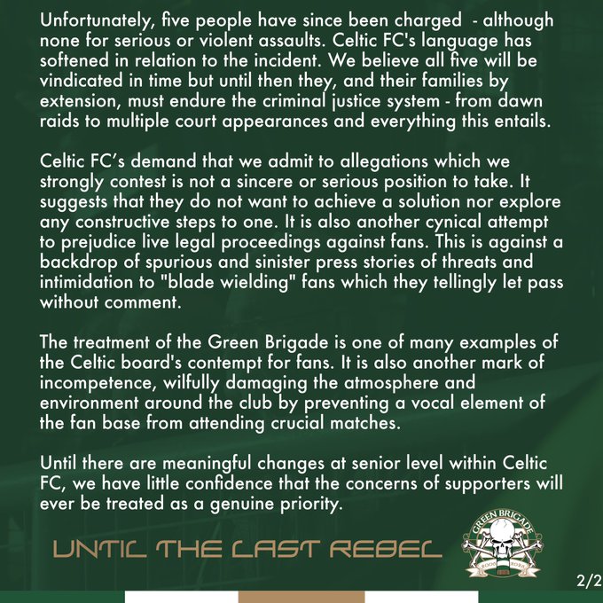 “The treatment of the Green Brigade is one of many examples of the Celtic board’s contempt for fans. It is also another mark of incompetence, wilfully damaging the atmosphere and environment around the club by preventing a vocal element of the fan base from attending crucial matches.”