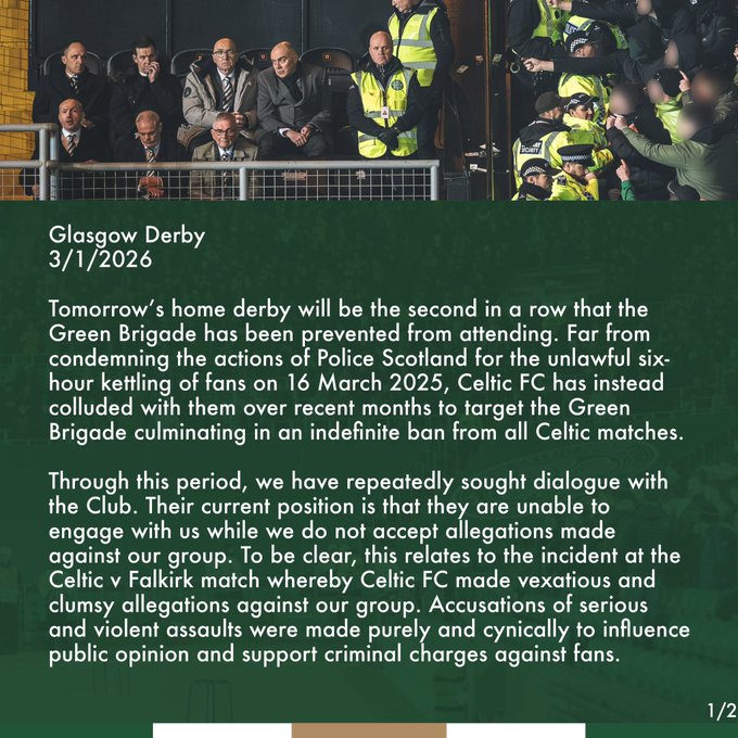 “Far from condemning the actions of Police Scotland for the unlawful six-hour kettling of fans on 16 March 2025, Celtic FC has instead colluded with them over recent months to target the Green Brigade culminating in an indefinite ban from all Celtic matches.”
