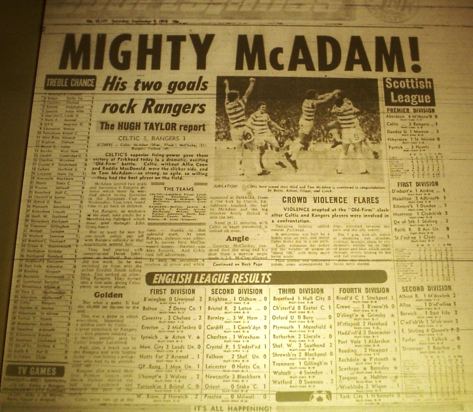 Tom McAdam picked up a harsh booking against Partick Thistle on 26 April 1980, the significance of this was that it ruled him out of the Scottish Cup Final against Rangers through suspension. Celtic won the Final 1-0 with George McCluskey getting the goal. The Celtic fans entered to park in jubilation to be met by angry, aggression from the Rangers support.