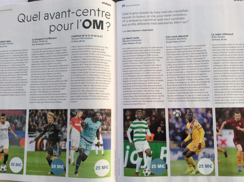 Featured alongside Dembélé in the list are such luminaries as Wissam Ben Yedder of Sevilla (and the hammer of Manchester United at Old Trafford two weeks ago), Danish starlet Kasper Dolberg of Ajax, Edin Dzeko and Christian Benteke. And, interestingly, France Football suggests that the asking price for Dembélé could be €25M.