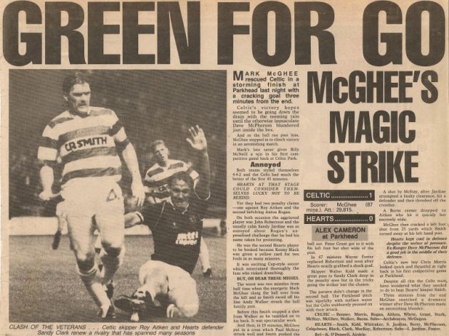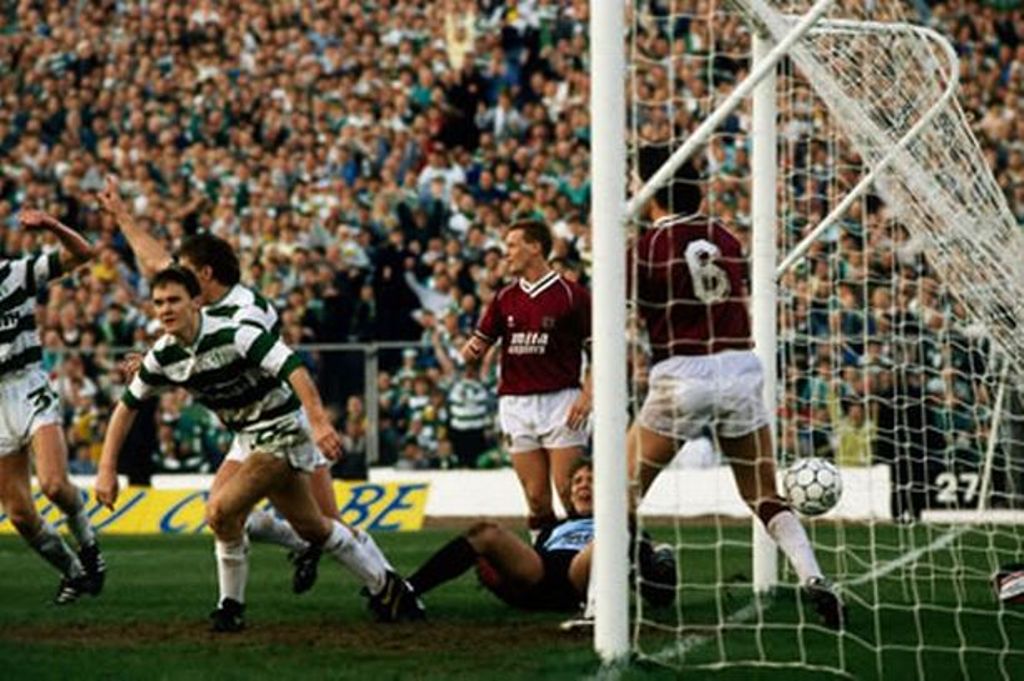 Then, as the clocked ticked down and time was running out, that wee bit of Celtic magic finally raised its head, the stuff that dreams are made of, the defining moments that stay in your head for years to come. Celtic equalised! It was really late in the game, surely only a few minutes to go, as Tommy Burns swung in a left-footed corner-kick in front of the Celtic End. Hearts keeper Henry Smith came out to clutch the ball and somehow, just somehow, he dropped it. Right at the feet of Mark McGhee.