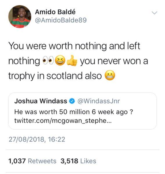 This evening a former Celtic striker got involved in the argument. Amido Balde told Windass, “You were worth nothing and left nothing. You never won a trophy in Scotland also,” much to the delight of Celtic fans.