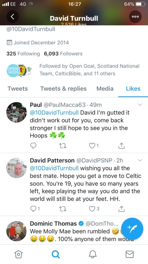 David Turnbull is making it known that he wants to join Celtic and is pretty unhappy at the deal collapsing yesterday, judging by the various items that have appeared on social media. There’s a WhatsApp group which could be genuine where he is clear about wanting The Celtic deal to proceed.