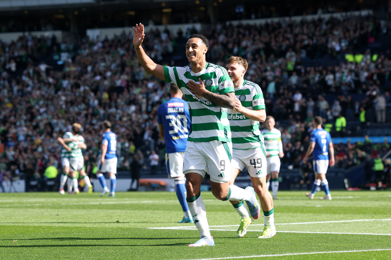 Adam Idah of Celtic celebrates after scoring his team’s third goal during the Scottish Gas Scottish Cup Semi Final match between St Johnstone and Celtic at Hampden Park on April 20, 2025. (Photo by Ian MacNicol/Getty Images)
