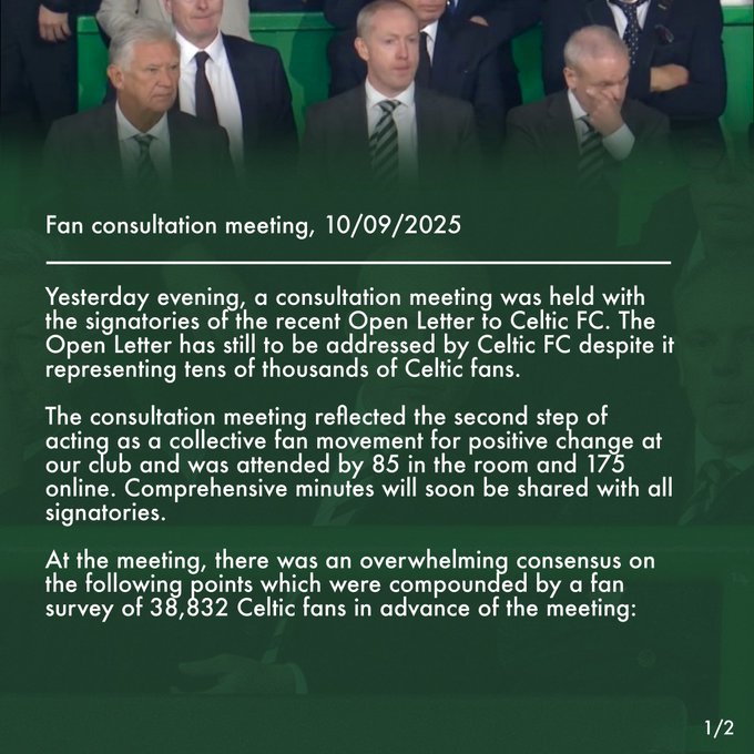 The meeting, attended by 85 in person and 175 online, was the second step in acting as a collective fan movement for positive change. What emerged was an overwhelming consensus, underpinned by a tally of 38,832 Celtic fans engaged ahead of the meeting.