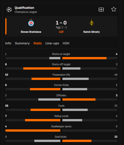 No further goals in extra time in what was an evenly contested match. So the game went to penalties with Slovan at one stage 3-1 ahead in the shoot-out. However things went horribly wrong for the hosts after that with FC Kairat ending up 4-3 winners on penalties after the tie ended 1-1.