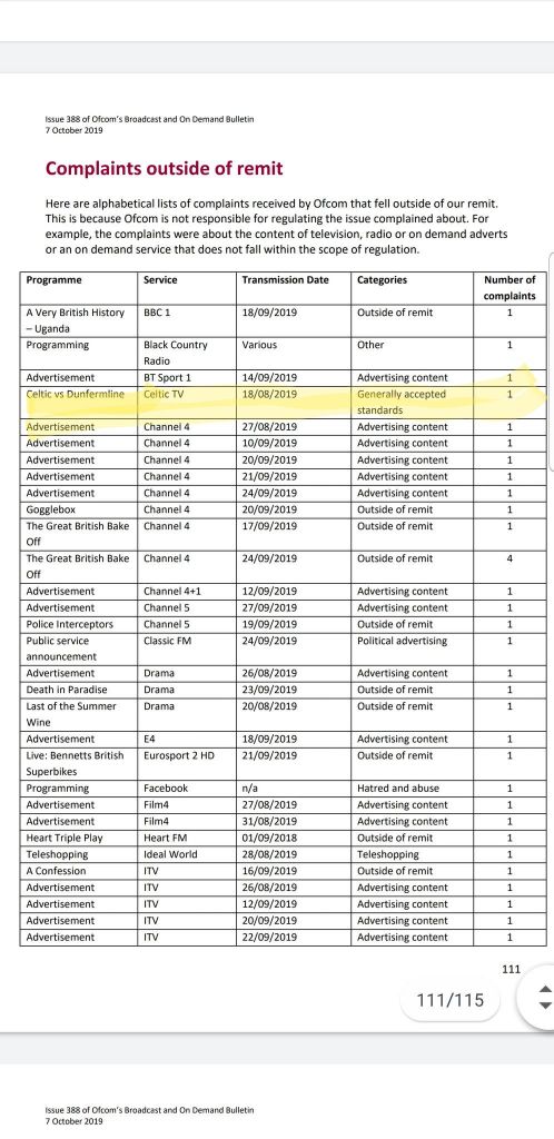 That appeared to be the end of the story until today when we have discovered that Ofcom have also received a complaint, presumably in English (if not from…) but this has been thrown out. Hey, they call Celtic Supporters Obsessed!