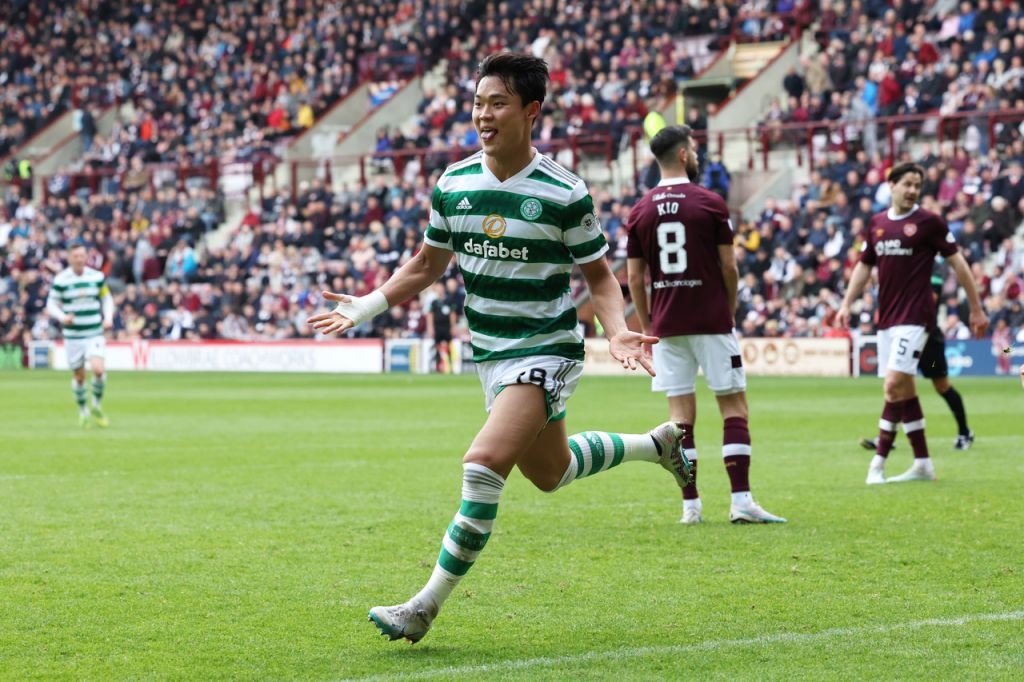 Kyogo Furuhashi of Celtic celebrates after scoring the team’s first goal during the Cinch Scottish Premiership match between Heart of Midlothian and Celtic FC at Tynecastle Park on May 07, 2023. (Photo by Ian MacNicol/Getty Images)