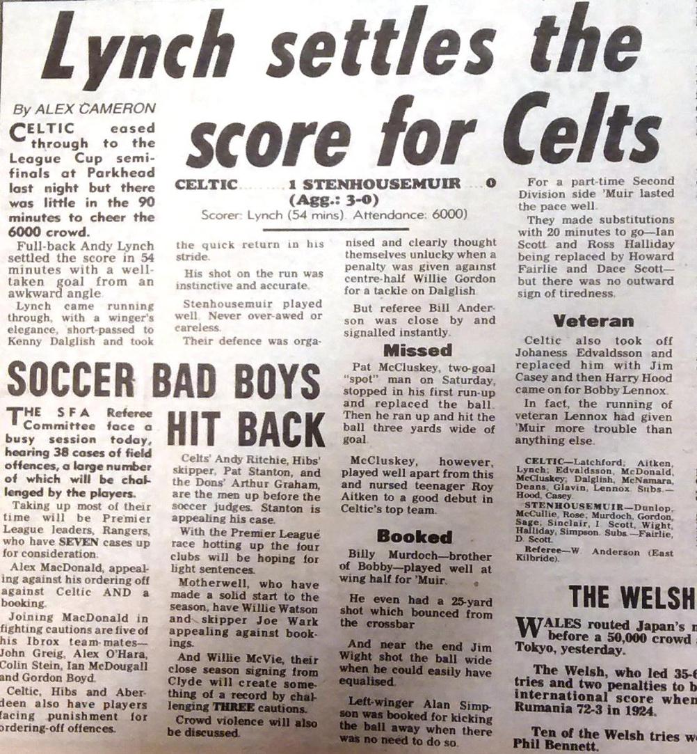 Celtic’s dreadful record from the penalty spot continued, Pat McCluskey fresh from his Perth double blasting the ball wide of the post after Kenny Dalglish had been brought down midway through the first half. The only goal of a low-key encounter came 10 minutes into the second half, Andy Lynch playing a one-two with Dalglish before beating Warriors’ keeper Ray Dunlop with a tidy finish to seal a spot in the last-four draw for the cup-holders.