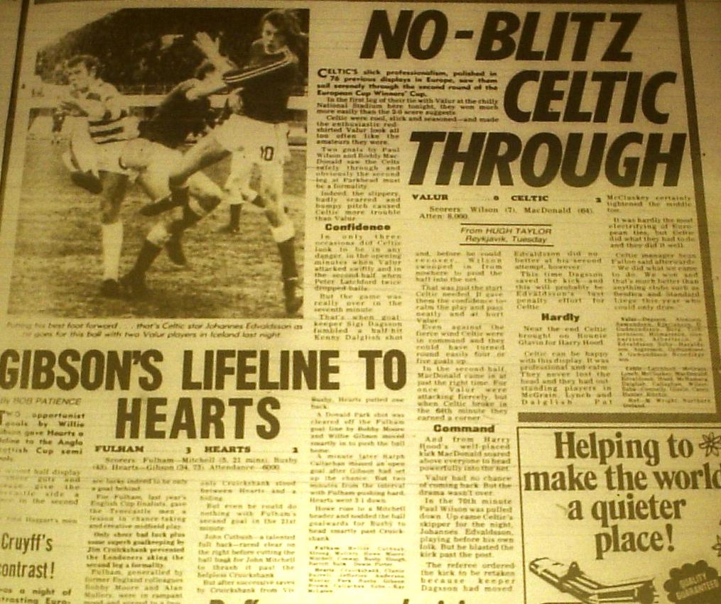 There would also be a nice reunion for Harry Hood, with his former Clyde teammate, Joe Gilroy, now managing Valur. With Bobby Lennox suspended, following his ridiculous ordering off against Olympiakos in Piraeus 12 months earlier, the first Celtic team to play on Icelandic soil lined up as follows.