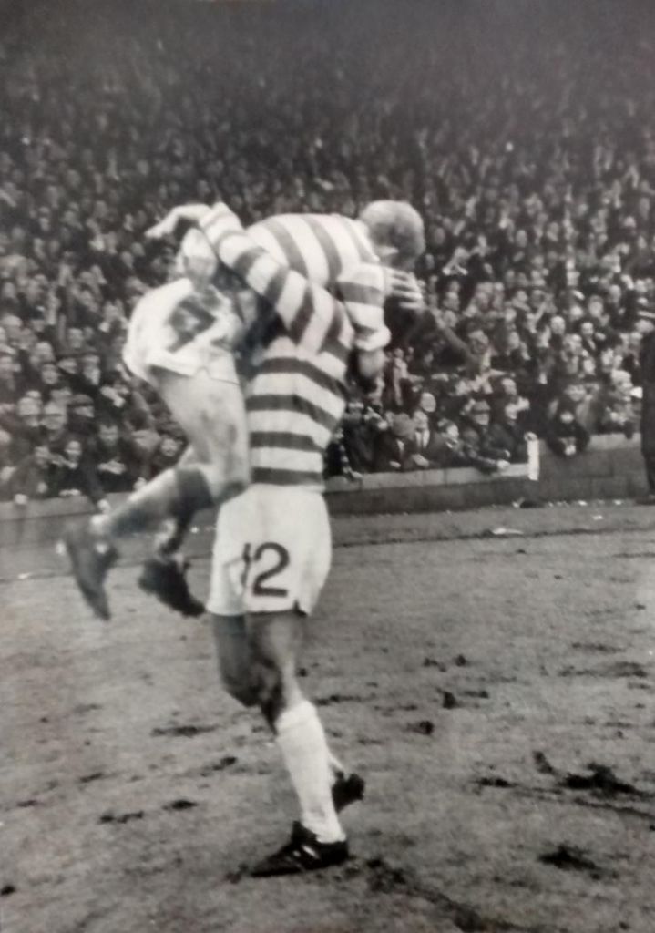 With the match seemingly destined for an Ibrox replay, Stein’s latest tactical decision would reap dividends. There were only five minutes left on the clock when Davie Hay strode through the midfield mud to unleash the most glorious shot past the German keeper into the roof of the net, as Parkhead erupted, not a bad way to score your first goal for Celtic. Jimmy Johnstone then made certain of a semi-final place for the holders by netting a third in the final minute, the little winger lifted into the air in triumph by Harry Hood in front of the Jungle, in another iconic Celtic moment.