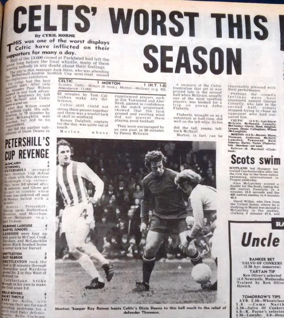 Following the Scottish Cup semi-final victory over Dundee, the remainder of April 1975 saw that inconsistency of performance which had plagued Celtic all season continue to affect the final League fixtures. It began with a 1-1 home draw with Morton, which saw Kenny Dalglish captain the team for the first time, Danny McGrain score an own goal to level things after an early Paul Wilson strike and Brian McLaughlin come off the bench for his first appearance of the season, before we had the bizarre sight of George Connelly simply giving up on a chase with a Morton forward late on, an indication that all was clearly not well with the player.