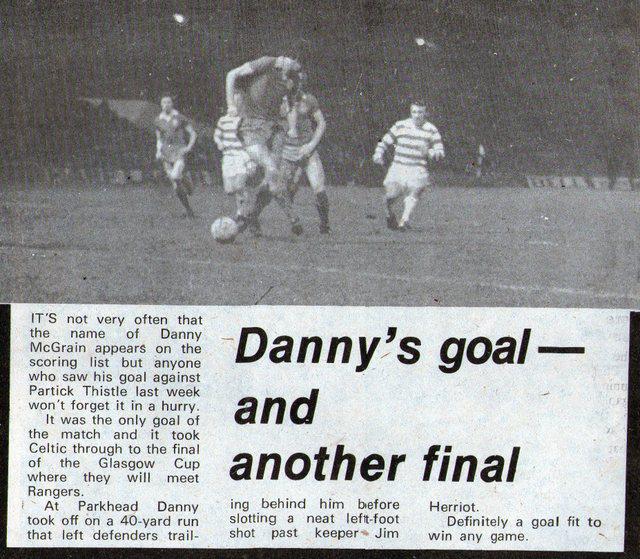 Well, he had almost everything. He rarely scored a goal. In fact, most of Danny’s goals are items of note, due to how seldom he managed it. JFK moments. McGrain would make an exception this night by scoring what The Celtic Wiki described as the best goal of his career. As we approached the half-hour, he picked the ball up on the halfway line, charging into the box to beat several Thistle defenders before placing his shot past former Scotland keeper Jim Herriot, sending Celts into the final.