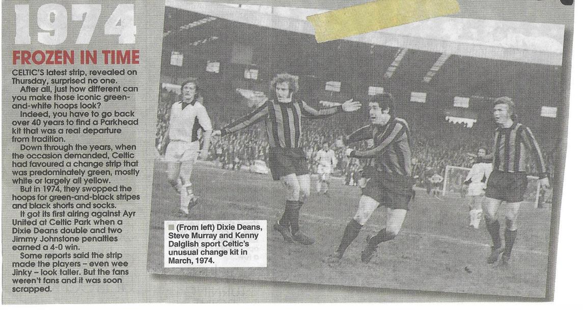 There were two novel sights as League business recommenced with a home clash with Ayr United three days later. The obvious one was the first appearance of Celtic’s new change kit, black and green vertical stripes with black shorts and socks. From memory, it had been made popular by Coventry City and it would later be recycled in the Gordon Strachan era, a Champions League game at Old Trafford and a title-clincher at Kilmarnock springing to mind.