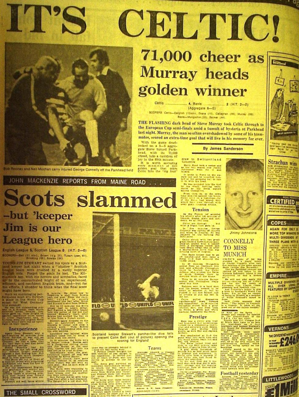 The winner, when it arrived, was a real seminal moment in the career of Steve Murray. With five minutes of the first period of extra-time remaining, Hood again showed wonderful poise and footwork in the box to hit the byeline, before pitching a cross to the far post, where Jimmy Johnstone was always second favourite to beat his Swiss marker in the air. However, pressure from the little winger forced the defender to miscue his clearance, the ball dropping towards Murray in the six-yard box. One stretch of the neck muscles sent the ball past Kunz, Celts into the last four and Steve into Celtic folklore. There was pandemonium in the old stadium and this time there would no way back for FC Basel, as the Hoops marched into the semi-final.