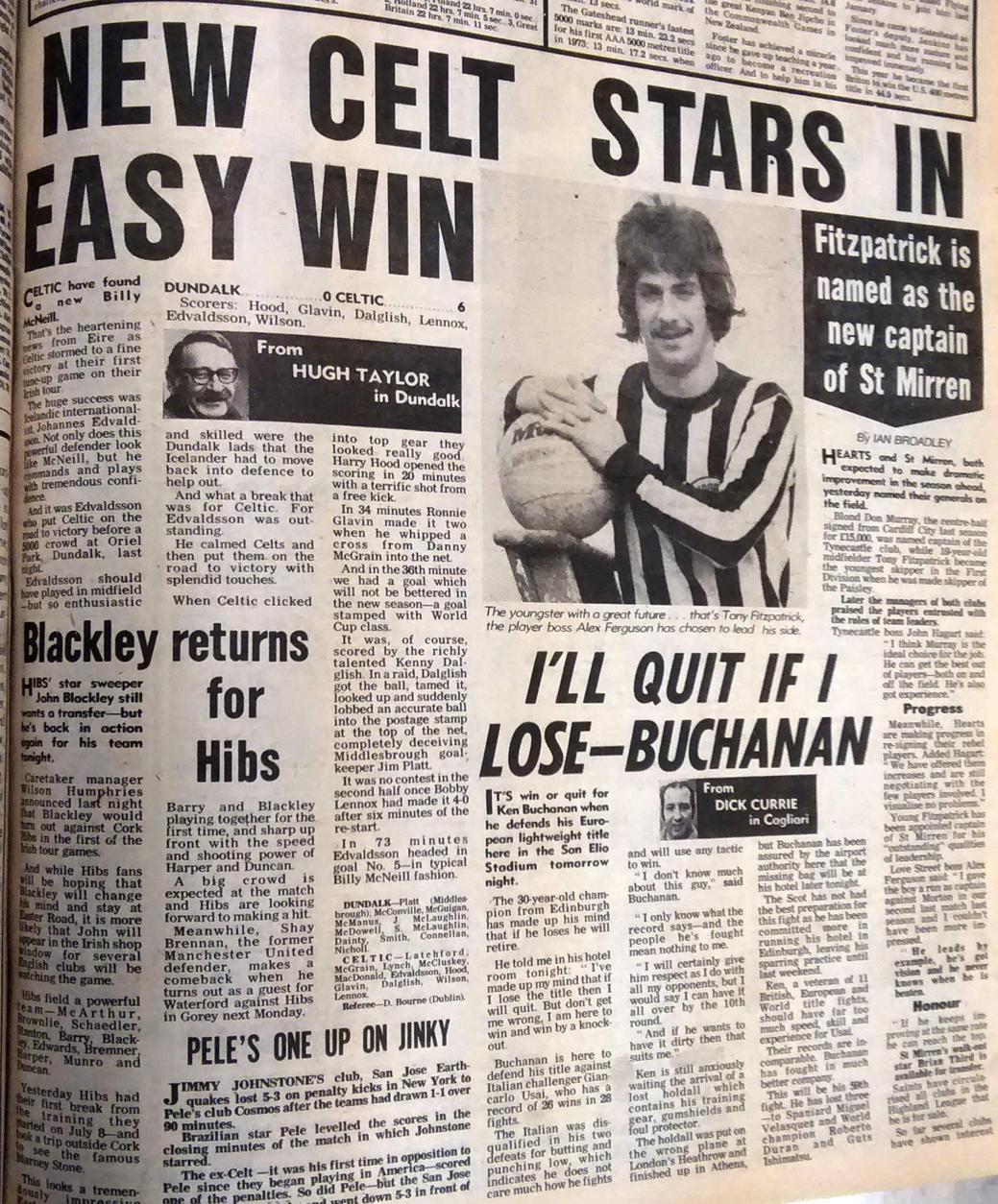 I recall it being a thoroughly enjoyable afternoon in the summer sunshine, with Celtic very much on the front foot. The headline-writers would have a field day as the only goal of the game was scored on the hour by Edvaldsson, the big Icelander swivelling to rifle the ball past Graham Moseley in the visitors’ goal after good work by Danny McGrain and Paul Wilson.