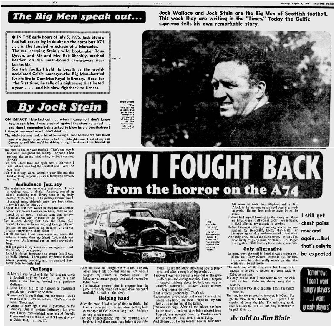 There was very nearly another Celtic legend leaving us in tragically different circumstances. On the morning of Saturday, 5 July 1975, we awoke to the horrible news that Jock Stein had been seriously injured in a car accident whilst travelling home from England on the notorious A74, following a family holiday abroad. He would, thankfully, recover in time, by far the most important concern, however, that would be not be for a considerable period, the first-team reins being passed to his friend and right-hand, Sean Fallon. It would be the Iron Man from Sligo who would lead Celtic into the brand-new Premier League era the following month.