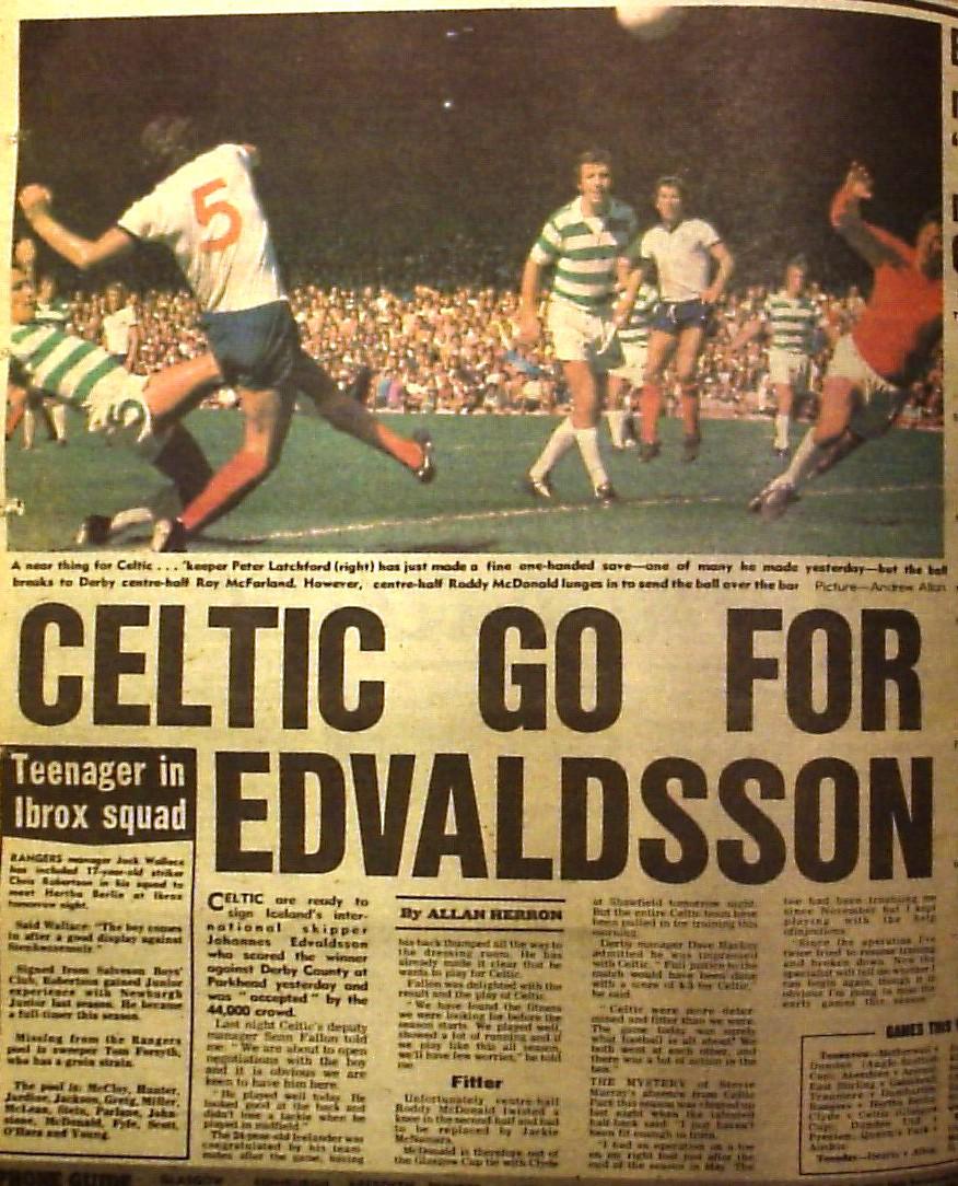 Saturday, 2 August 1975 was the first opportunity for Scottish-based Celtic supporters to take a look at Johannes Edvaldsson, a combination of that and the glorious sunny weather drawing over 44,000 for the home pre-season challenge match with English champions Derby County. The Rams were managed by former Hearts and Tottenham Hotspur legend Dave McKay, who had led them to promotion in 1969 under Brian Clough, before following him as a title-winner with the East Midlands club in 1975. County were a side packed full of internationalists, Bruce Rioch and Archie Gemmill perhaps the names most familiar to Scottish football supporters.