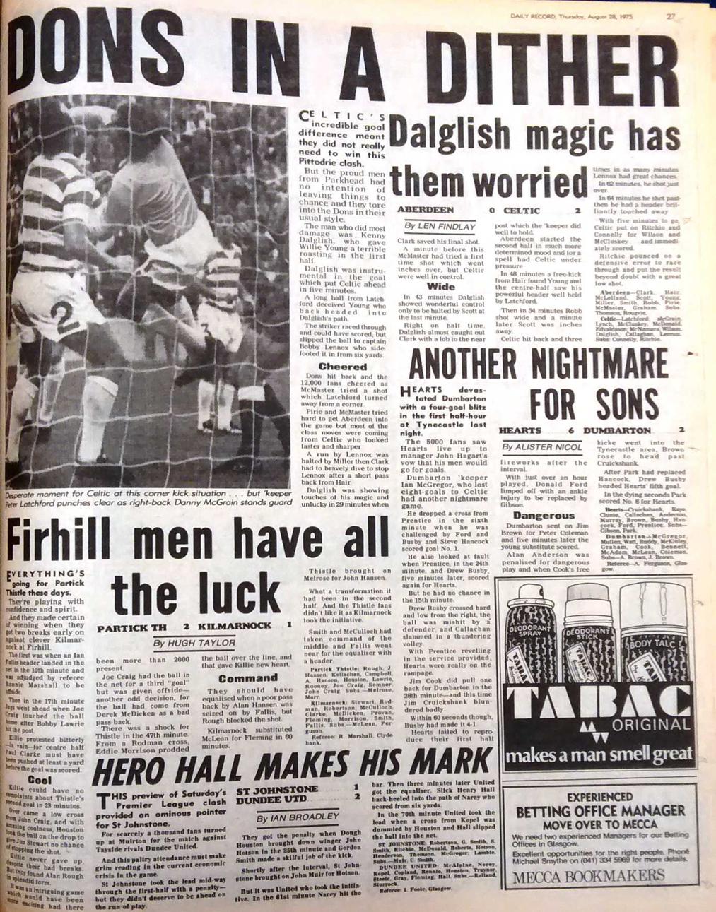 Qualification from the League Cup section was assured three days later, Saturday, 23 August 1975, as Celts ran riot at Boghead Park, Dumbarton. There was a sideshow to the main event as Ally Hunter refused the offer of a switch between the clubs as part of a package designed to have Tom McAdam score goals for Celtic rather than against them. The in-demand Sons striker was in his usual place at kick-off, but he was a mere onlooker as the Hoops attacking players filled their collective boots, Harry Hood, Kenny Dalglish then Paul Wilson with a double apiece, Danny McGrain adding a rare strike to his CV and even substitute Tom Callaghan chalking one up. When referee Bob Valentine called time, it would be a mercy for those wearing home colours, Celts winning 8-0 after a stunning display of attacking strength.