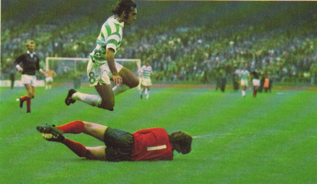 Just under 70,000 turned up to watch Celtic dominate but contrive to lose the match following Kenny Dalglish’s sublime opening goal just before the break. The move started with an unlikely source, young Roddie MacDonald showing lovely control to work the ball clear at his own corner flag under pressure from Sandy Jardine, before playing a one-two with Jackie McNamara. The big defender then played a long pass down the right touchline, where a beautiful head-flick from Danny McGrain picked out the run of Dalglish driving at the Rangers defence. With Paul Wilson clear on the left, the King shot just as Jardine’s recovery sprint saw him slide in to make a block, the ball skidding over Stewart Kennedy to nestle in the far corner.