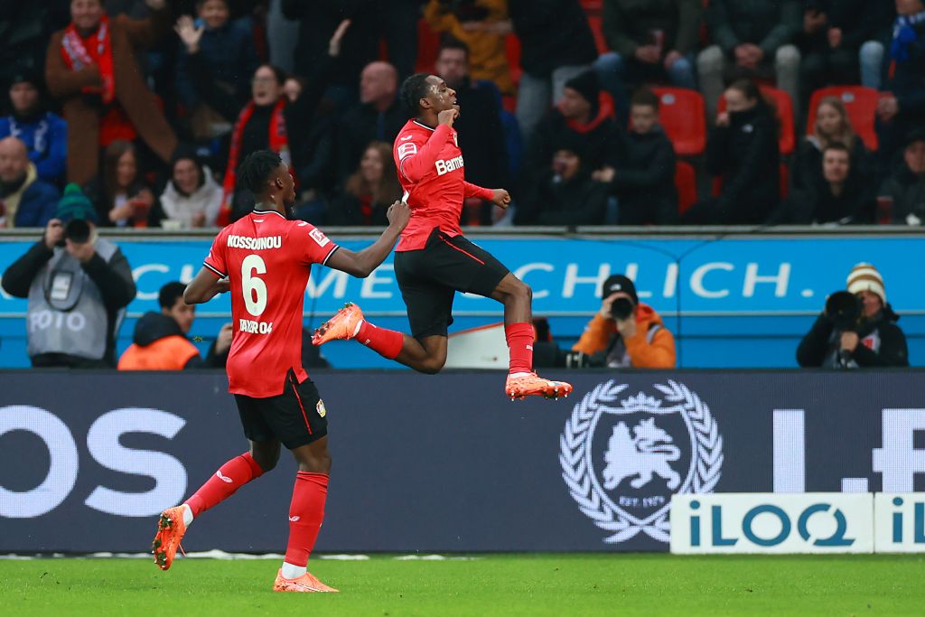 Jeremie Frimpong of Bayer 04 Leverkusen celebrates after scoring the team’s second goal during the Bundesliga match between Bayer 04 Leverkusen and Hertha BSC at BayArena on March 05, 2023 in Leverkusen, Germany. (Photo by Martin Rose/Getty Images)