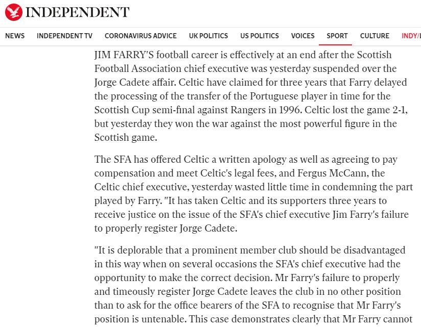 That issue has been buried now. In the past we have seen Fergus McCann take the SFA to court and win. Jim Farry was a proven cheat. Dougie McDonald was exposed as a liar when his linesman outed him after he overturned Celtic’s penalty at Tannadice. Hugh Dallas has been forced to resign due to being caught out sending sectarian emails. Throughout that time no club stood up to demand fair play.