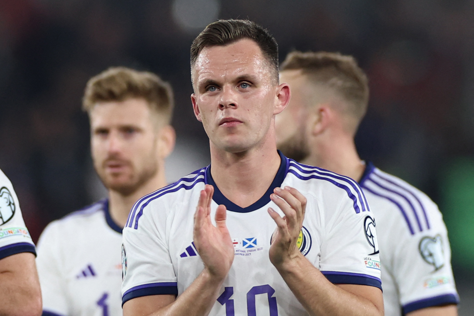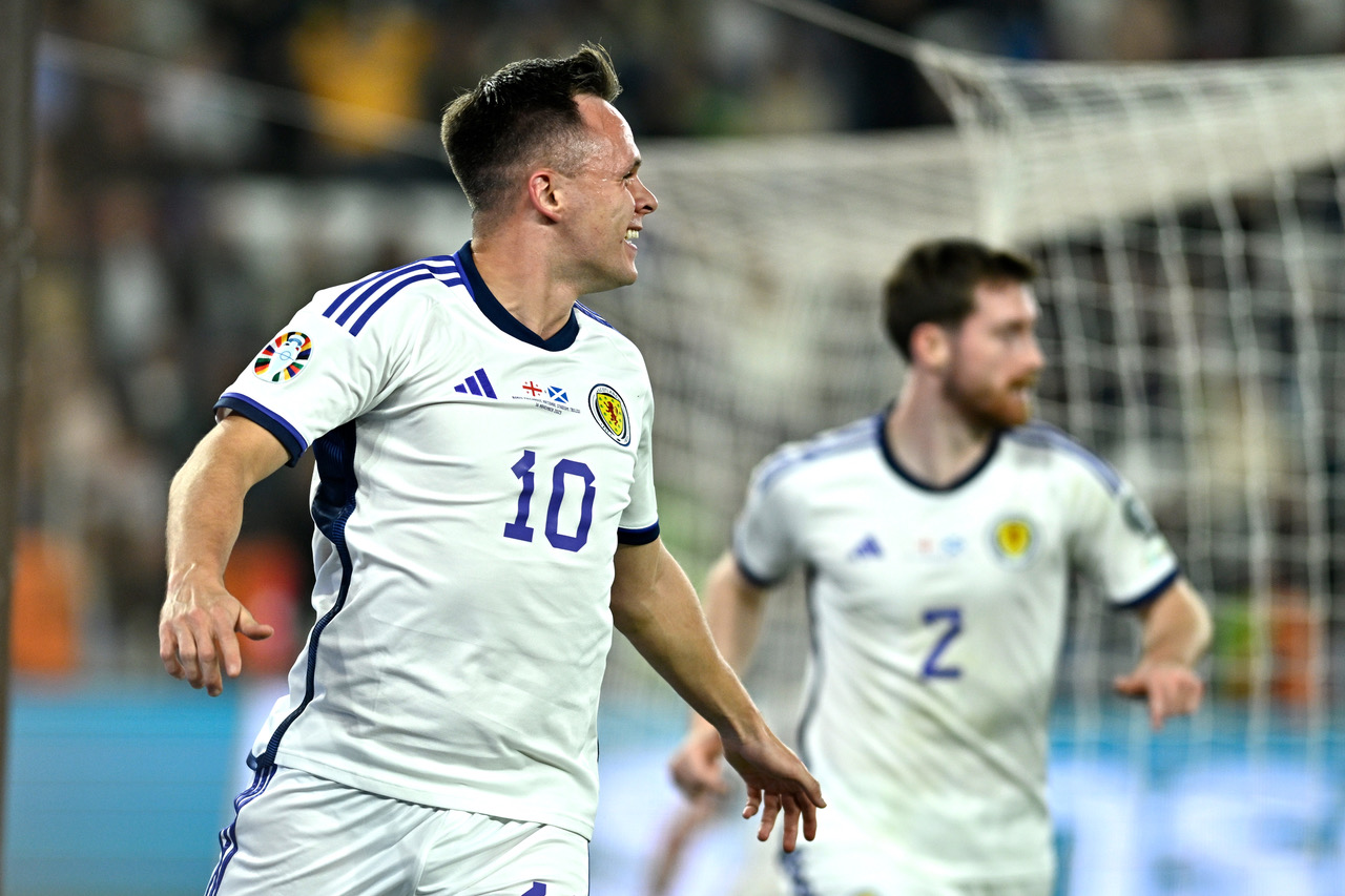 Scotland’s striker Lawrence Shankland and teammates greet supporters after the UEFA Euro 2024 football tournament Group A qualifying match between Georgia and Scotland in Tbilisi on November 16, 2023. (Photo by GIORGI ARJEVANIDZE/AFP via Getty Images)