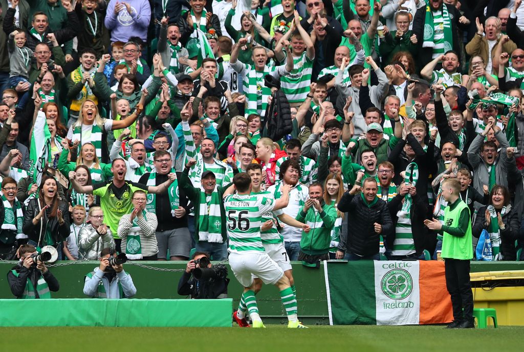 Mikey Johnston celebrates with Anthony Ralston as he scores his team’s first goal during the Scottish Premiership match between Celtic and Hearts at Celtic Park on May 19, 2019. (Photo by Ian MacNicol/Getty Images)
