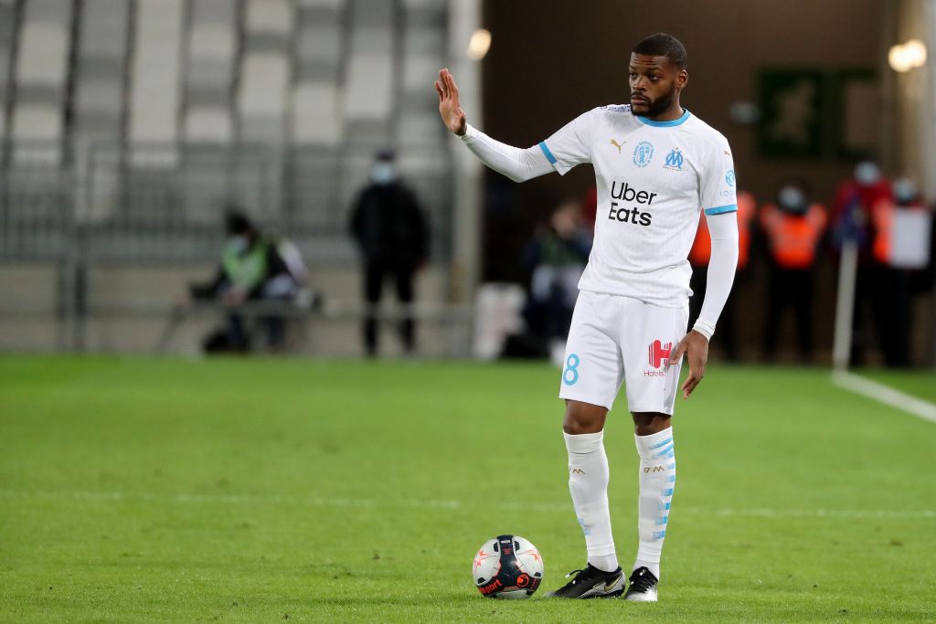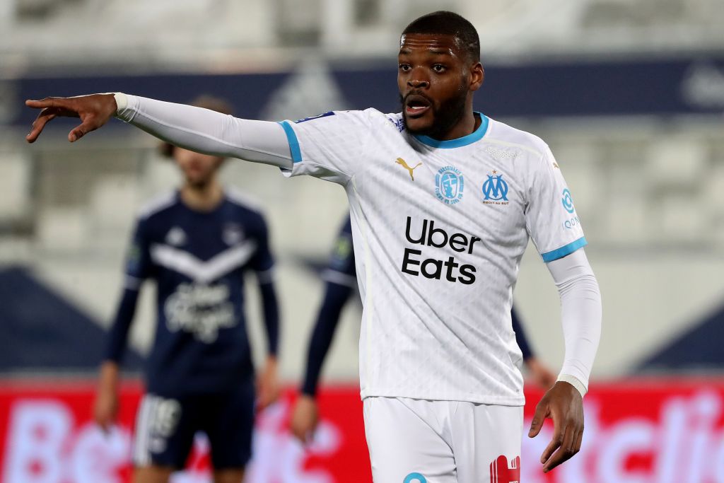 Marseille’s French midfielder Jules Olivier Ntcham gestures during the French L1 football match between FC Girondins de Bordeaux and Olympique de Marseille at The Matmut Atlantique Stadium in Bordeaux, south-western France on February 14, 2021. (Photo by ROMAIN PERROCHEAU / AFP) (Photo by ROMAIN PERROCHEAU/AFP via Getty Images)