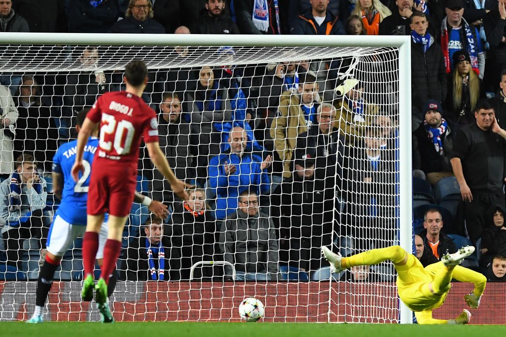 theRangers goalkeeper Allan McGregor fails to stop Liverpool’s Egyptian striker Mohamed Salah (not seen) from scoring his teams fifth goal during the UEFA Champions League match between theRangers and Liverpool at Ibrox on October 12, 2022. (Photo by ANDY BUCHANAN/AFP via Getty Images)