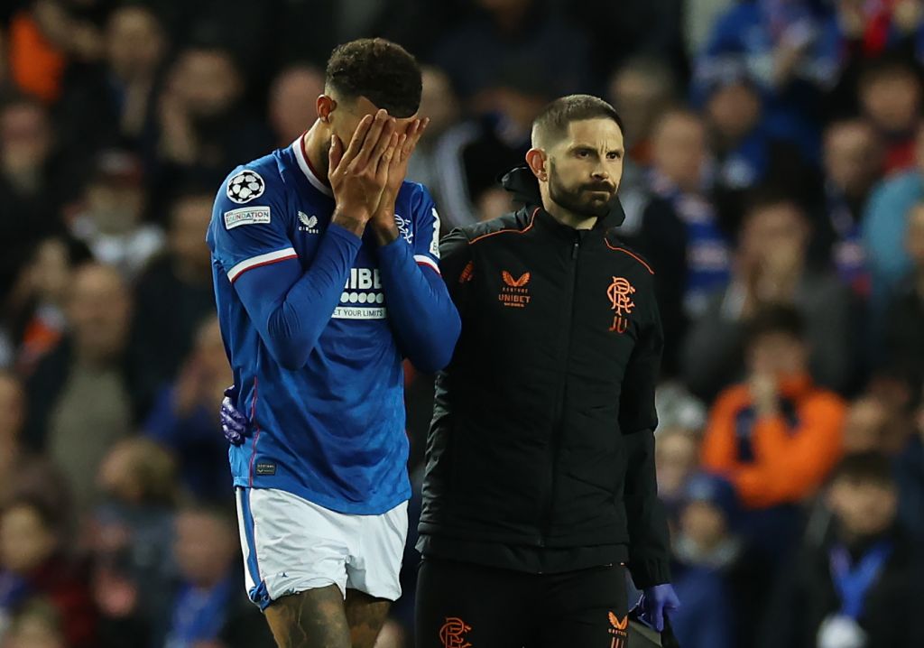 Goldson of theRangers is seen as he leaves the pitch injured during the UEFA Champions League match between theRangers FC and Liverpool FC at Ibrox on October 12, 2022 . (Photo by Ian MacNicol/Getty Images)