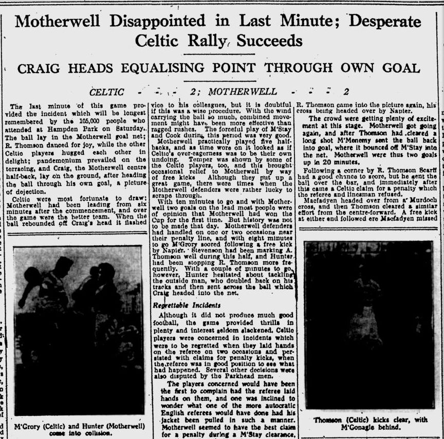 The minutes ticked away, and Celtic failed to find McGrory. The newspaper reporters were beginning to think about headlines “Well, it’s Well!” or “Celts Well licked by Mother” and one Motherwell newspaper reporter jumped the gun and sent his report in just before the final whistle!