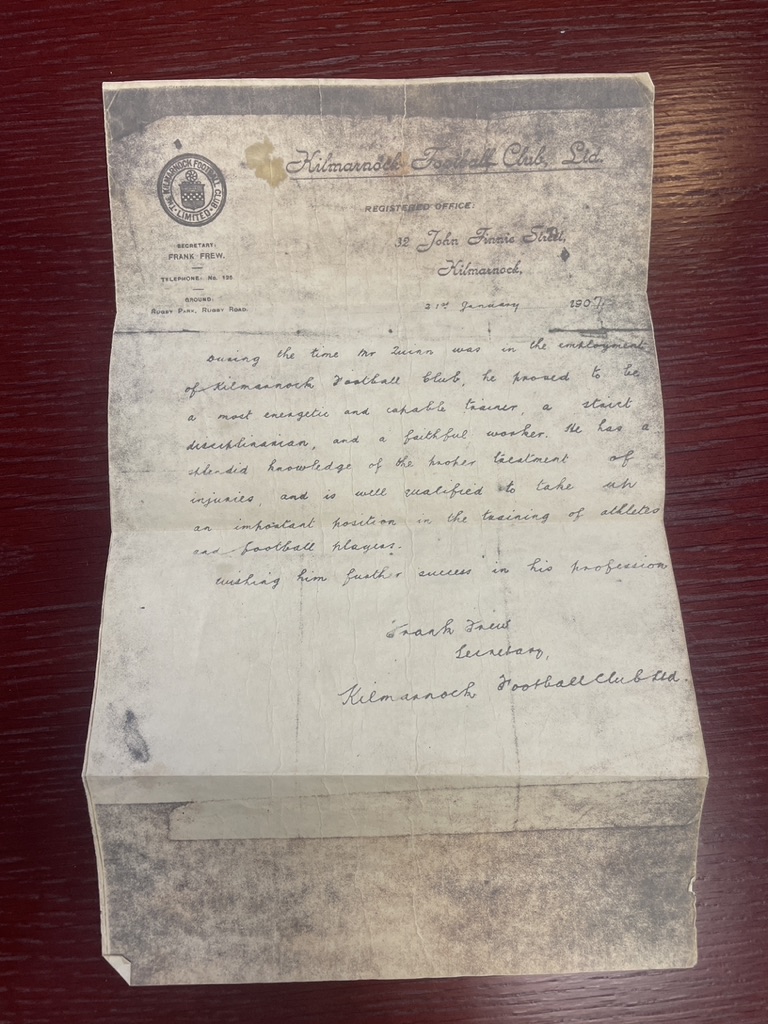 I’ve been very fortunate over recent weeks to be able to establish the context of so many of Will’s incredible items of memorabilia, from the 120-year-old wooden clock won by him as a runner at an Ibrox sports day, a letter of reference from Kilmarnock FC in 1907, to photographs showing him as a trainer of Scotland, Ireland and even Wales in the early 20th century. And there are some superb items yet to come from the 1930s.
