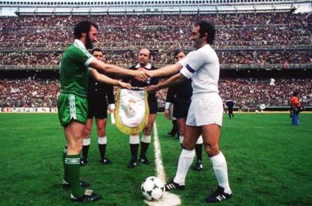 Danny McGrain of Celtic and Pirri of Real Madrid exchange pennants in the second leg of the 1980 European Cup quarter final tie in the Bernabeu on 19 March 1980. Photo The Celtic Wiki