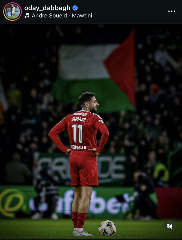 The Scottish Champions thumped the visitors from Pittodrie but despite this, Dabbagh has shared a picture of him with the North Curve in the background flying the Palestinian flag in support of the besieged people of Palestine.