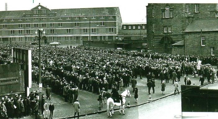 The picture shows fans queuing outside Celtic Park to purchase their tickets for the big match, which actually took place at Hampden because demand was so large that a stadium with greater capacity (as Hampden had back then) was required.