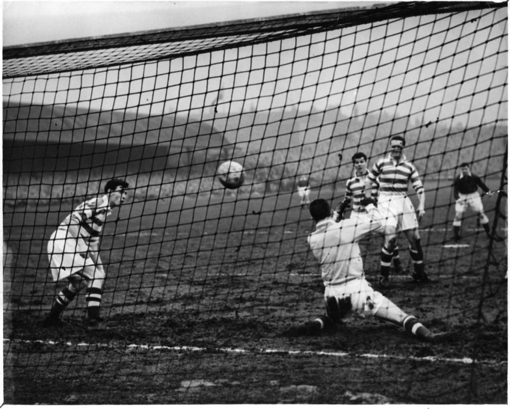 Peter looks on as Alec Young’s shot beats Dick Beattie to give Hearts a first-minute lead at Celtic Park. Bertie Peacock and Jock Stein are the other Celts in the photo plus Alfie Conn of Hearts. Jimmy Walsh equalised for Celtic early in the second half.