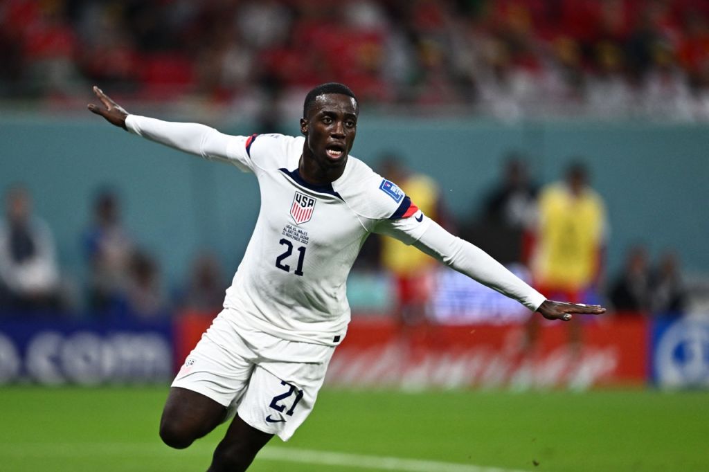 Timothy Weah of United States celebrates after scoring their team’s first goal as Chris Mepham of Wales reacts during the FIFA World Cup Qatar 2022 Group B match between USA and Wales at Ahmad Bin Ali Stadium on November 21, 2022 in Doha, Qatar. (Photo by Buda Mendes/Getty Images)