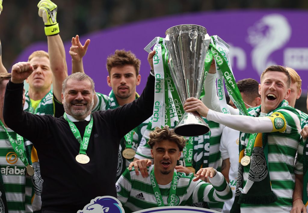 Ange Postecoglou celebrates winning the Scottish Premiership with his Celtic players, May 2022