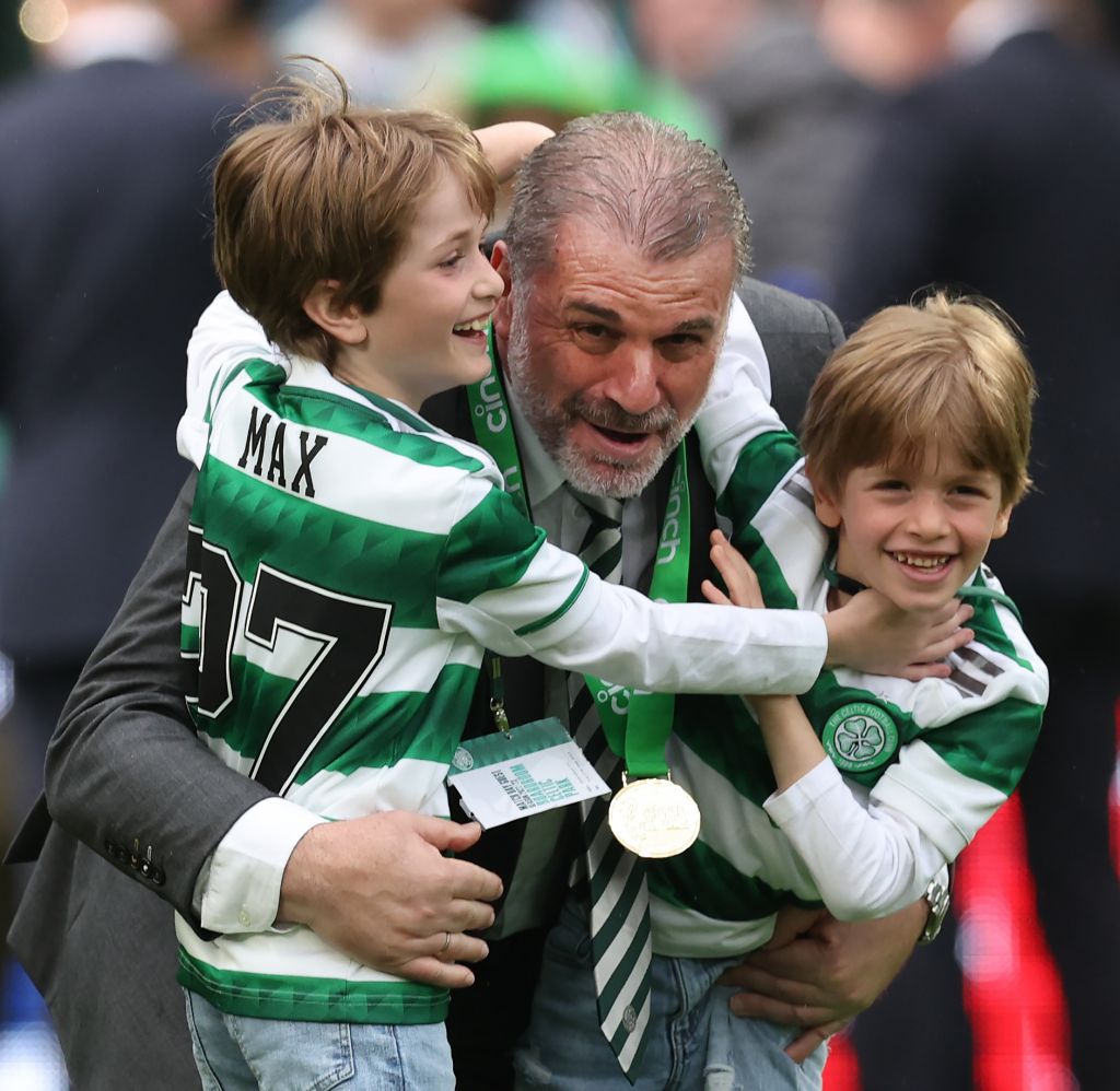 Celtic manager Ange Potecoglou is seen with his children during the Cinch Scottish Premiership match between Celtic and Aberdeen at Celtic Park Stadium on May 24, 2023. (Photo by Ian MacNicol/Getty Images)