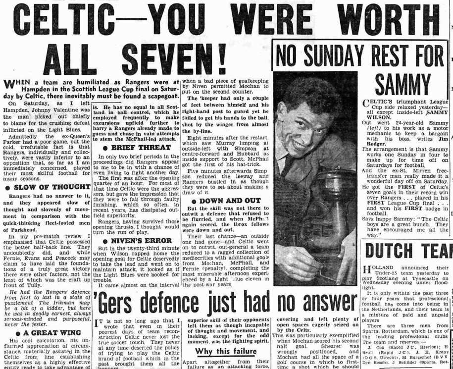 Every one of the seven goals (fortunately all available on You Tube) was well worked as Celtic simply showed the world what they could do with Fernie, Evans and Peacock constantly supplying the forward line. Billy McPhail scored a hat-trick, Neil Mochan two, Sammy Wilson one and Willie Fernie scored a penalty awarded by referee Jack Mowat whose sense of justice exceeded his compassion.