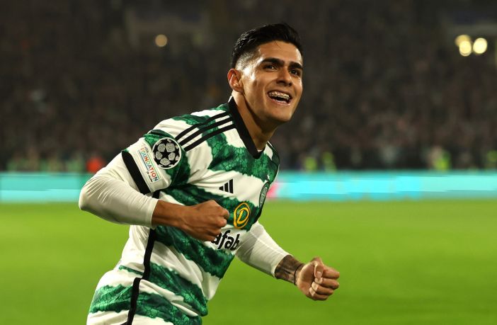 Celtic’s Japanese striker #08 Kyogo Furuhashi (L) celebrates after scoring his team first goal during the UEFA Champions League group E football match between Celtic and Atletico Madrid at Celtic Park stadium in Glasgow, Scotland, on October 25, 2023. (Photo by ANDY BUCHANAN/AFP via Getty Images)