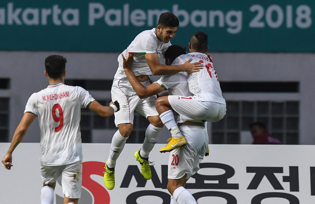 Mehdi Ghayedi (R) celebrates scoring during the men’s Group F football match between Iran and North Korea at the 2018 Asian Games at Cikarang on August 17, 2018. (Photo by CHAIDEER MAHYUDDIN / AFP viaGetty Images)