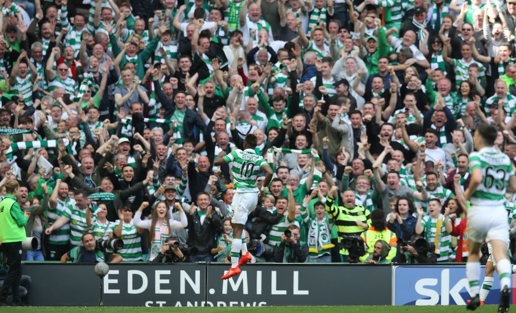 Moussa Dembele celebrates his 3rd goal ( Celtic’s 4th) during the Scottish Premiership match between Celtic and theRangers on September 10, 2016.. (Photo by Steve Welsh/Getty Images)