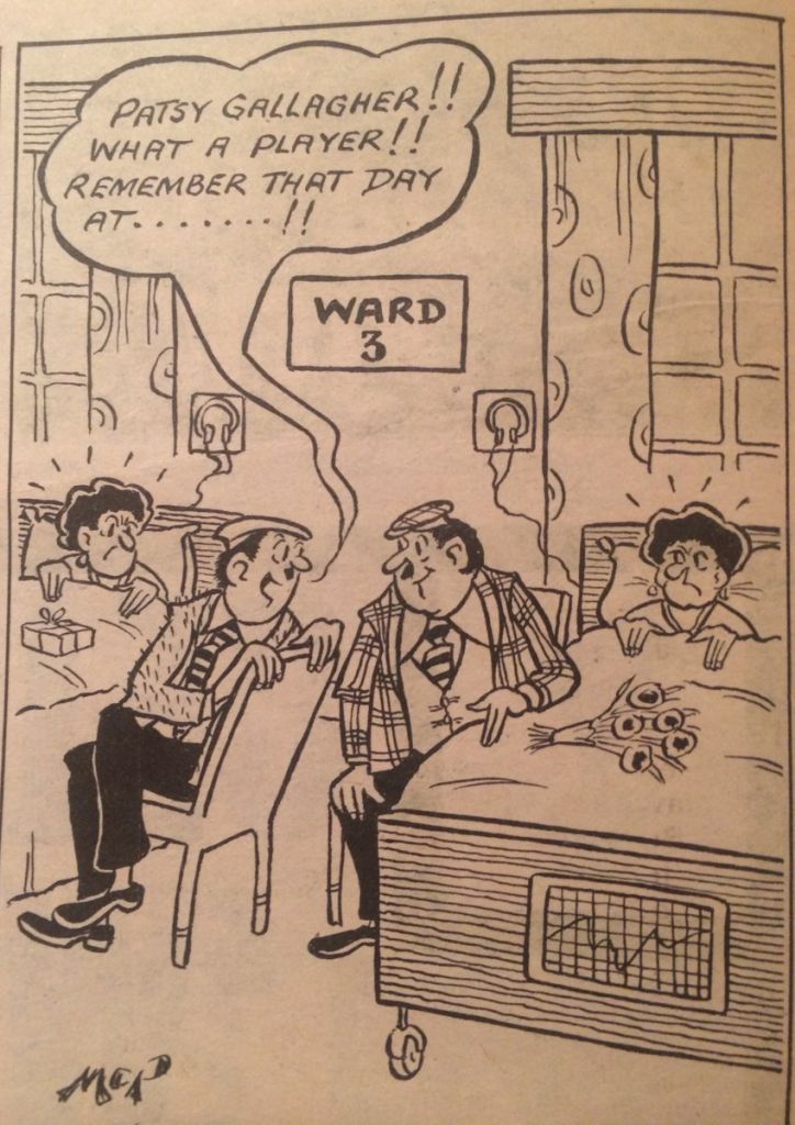 But war came in 1914, and Patsy was much diminished. It was not that he played any worse, but simply because the demands of war prevented that side from becoming what it could have been. But Patsy was “the most talked about man in the trenches”. He himself worked in the shipyards on munitions works, being fined for “bad timekeeping” in 1916 and thus being suspended from football as well! Under war regulations, they could do that!