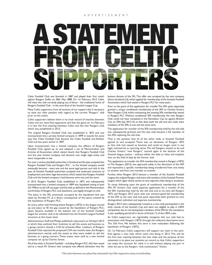 Here’s the Statement from Celtic Supporters that was published in the Sunday Herald on 25 January 2015, a week before Celtic played the new Ibrox club for the first time ever in the League Cup semi-final (they even brought out a t-shirt to commemorate reaching their first ever semi-final)…